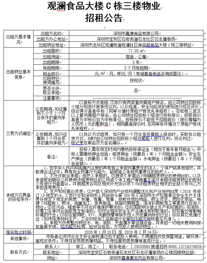 观澜食品大楼C栋三楼物业招租公告