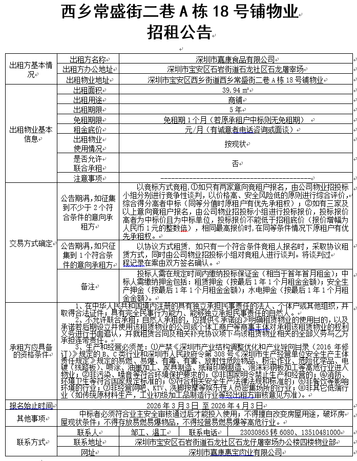 西乡常盛街二巷A栋18号铺物业招租公告
