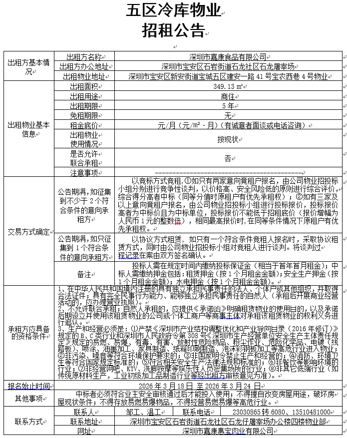 五区冷库物业招租公告