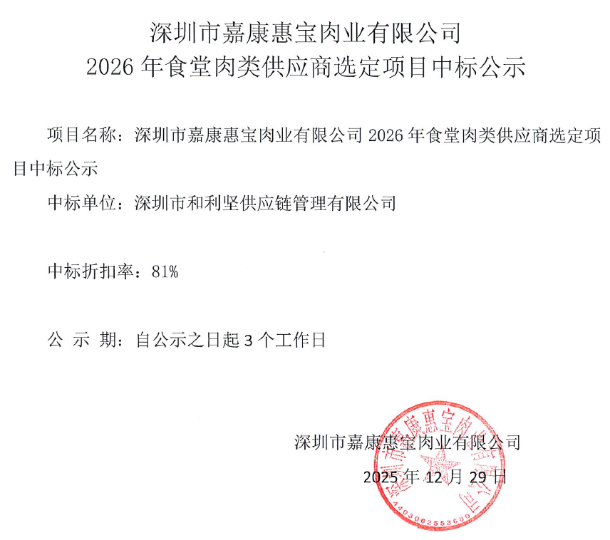 深圳市嘉康惠宝肉业有限公司2026年食堂肉类供应商选定项目中标公示