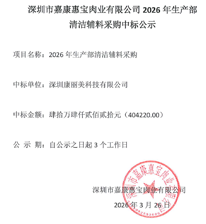 深圳市嘉康惠宝肉业有限公司2026年生产部清洁辅料采购中标公示