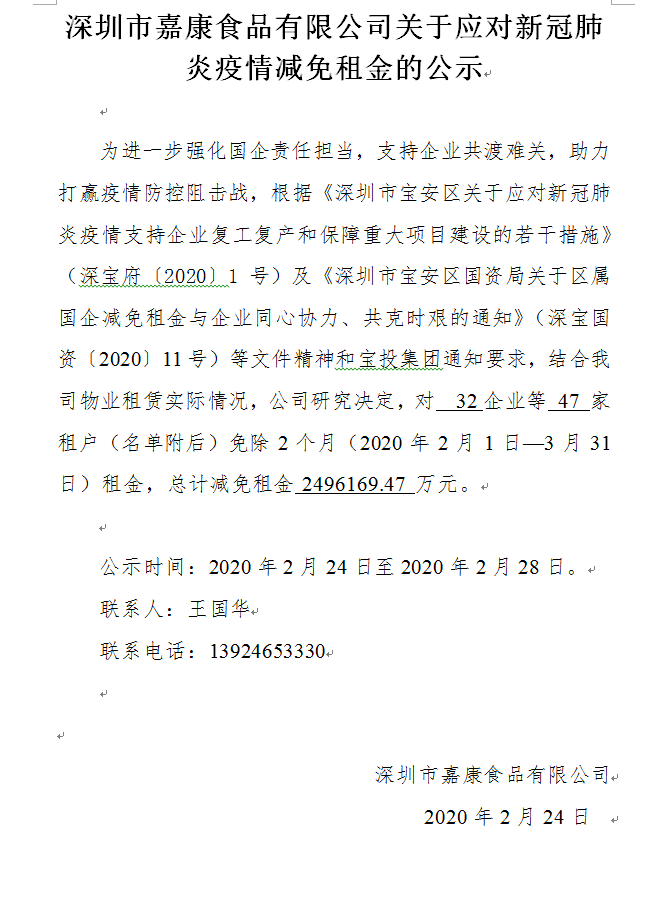 深圳市嘉康食品有限公司关于应对新冠肺炎疫情减免租金的公示
