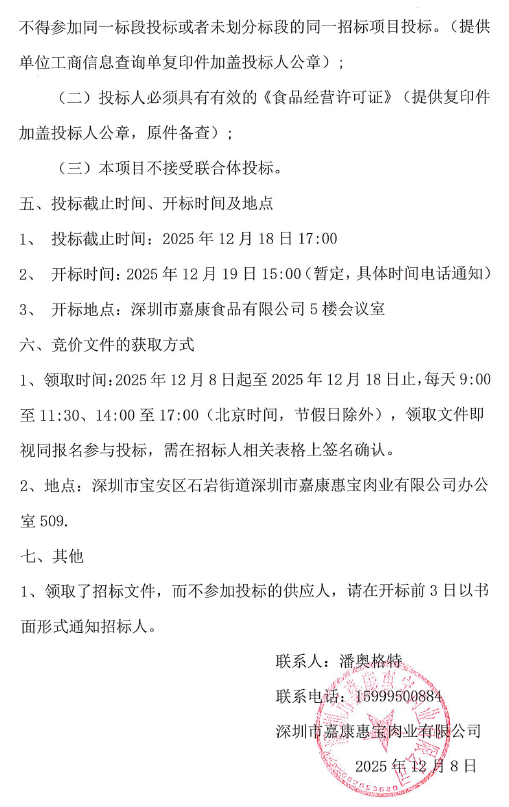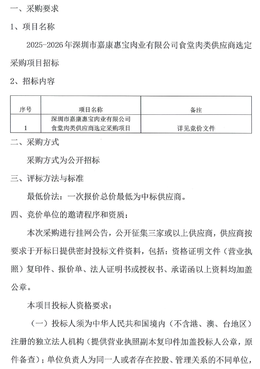 深圳市嘉康惠宝肉业有限公司食堂肉类供应商选定采购项目招标公告